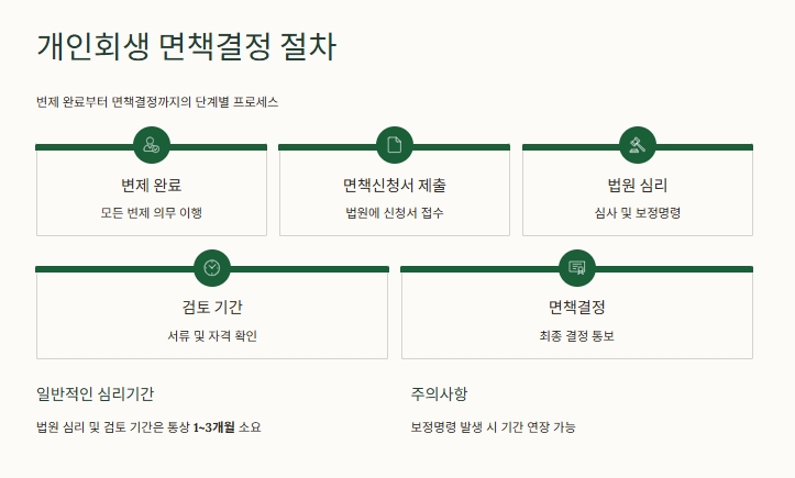 1️⃣ 변제 완료 2️⃣ 면책신청서 제출 3️⃣ 법원 심리 및 보정명령(필요 시) 4️⃣ 검토 기간 5️⃣ 면책결정 이렇게 진행되며, 각 단계마다 법원이 확인해야 할 항목이 많기 때문에 일정한 시간이 필요합니다.